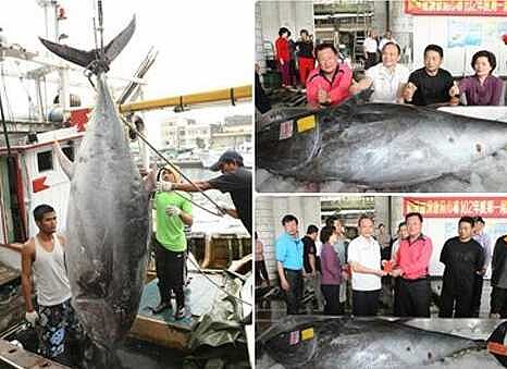 宜蘭縣南方澳今年捕獲的第一尾黑鮪魚,總重203公斤。18日由縣長林聰賢主持拍賣,以每公斤2300元的行情賣出,買主是「年年小館」餐廳委託鮮魚承銷人黃通明標得,引起饕客們的注目與垂涎。